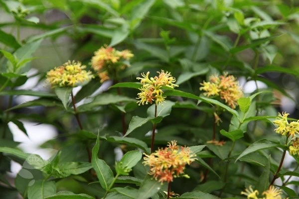 Copper-flushed green leaves emerge in spring on the gracefully arching, reddish stems. From early summer these are accompanied by clusters of small, trumpet-shaped yellow flowers, which turn a coral colour as they mature, and act as a magnet to butterflies. This suckering deciduous shrub is tough, and once established will tolerate dry conditions in full sun or partial shade. It is ideal for planting in wilder areas where it can spread, or in woodland gardens as an under-storey filler.