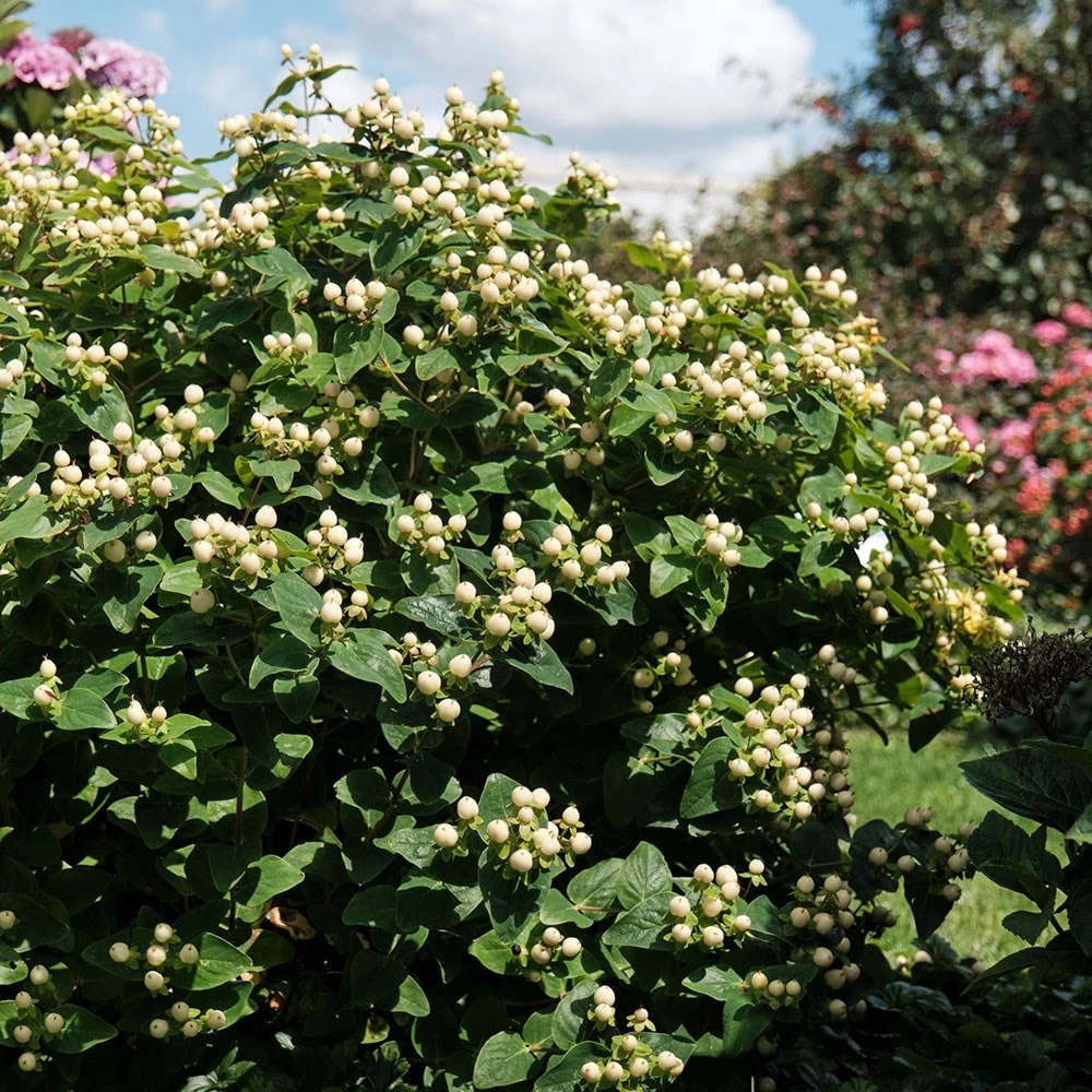 Admired for its abundant, golden yellow flowers bursting with stamens and its glossy white fruits, ‘Magical White’ is a gardener’s and flower arranger’s dream. Perfect in pots, it also performs magnificently in a sunny or partially shady spot, working tirelessly over a long season, with aromatic foliage, and concluding with a flourish of autumnal tints later in the year. Low maintenance, rust and deer resistance further enhance this plant’s potential as a pretty hedge, a plant for slopes, or naturalised en-masse blocks of colour.