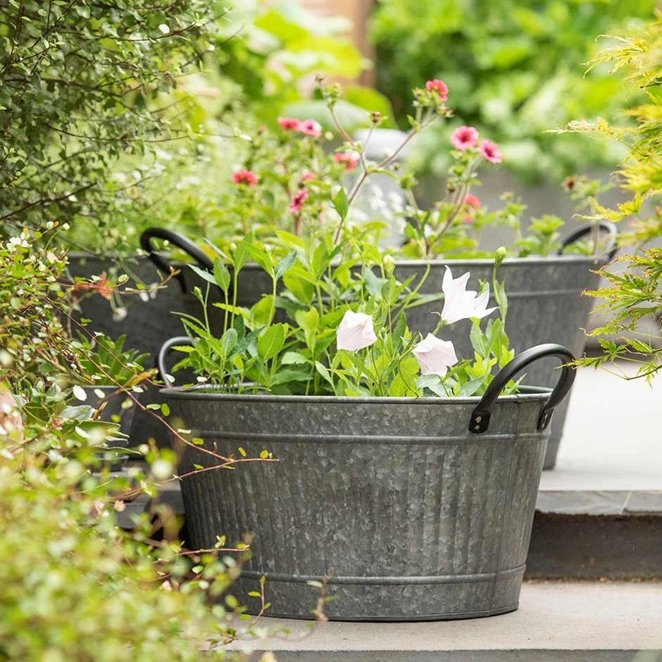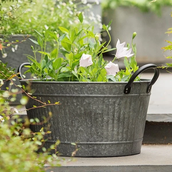 This versatile oval tub can be used for planting, storage or even as a unique drinks cooler for al fresco entertaining. Made from ribbed galvanised steel with an aged zinc finish and black powder-coated handles. Supplied without drainage holes; if using for outdoor planting, drill holes in the base.