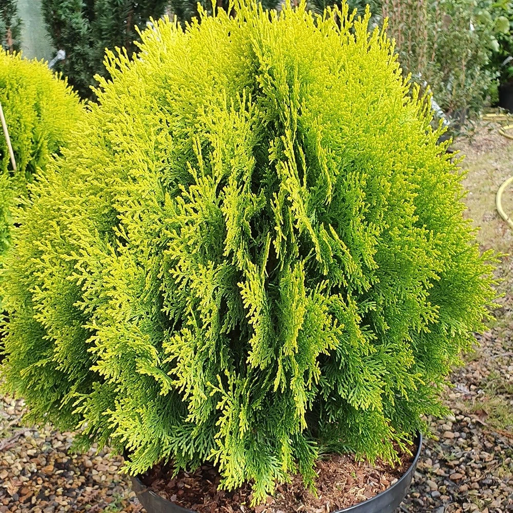 Upright sprays of yellow-green leaves, turning bronze in winter and flask-shaped cones. This delightful, dwarf golden Chinese thuja is an excellent specimen plant for a sunny rockery or border with moist, well-drained soil. Forming a neat, oval shape, it looks great surrounded by low-growing, lime-tolerant heathers and alpine plants.
