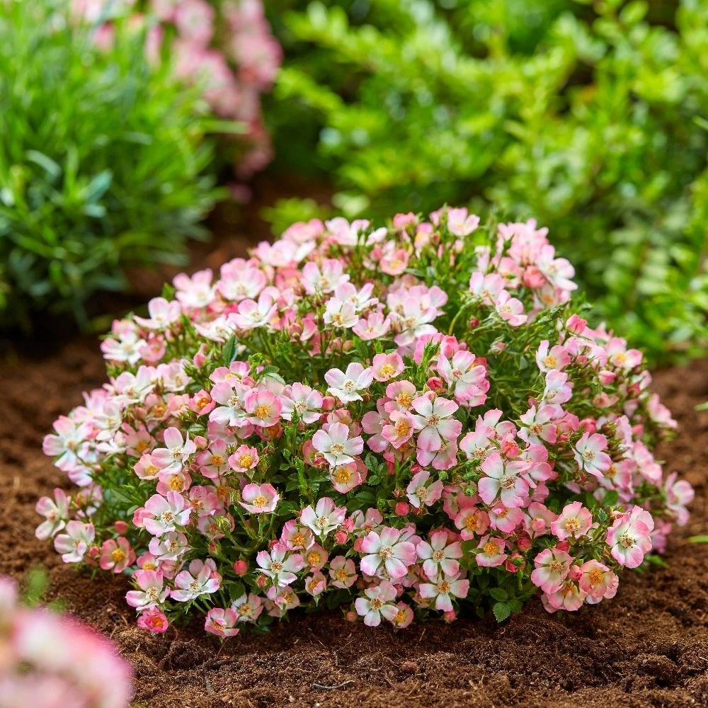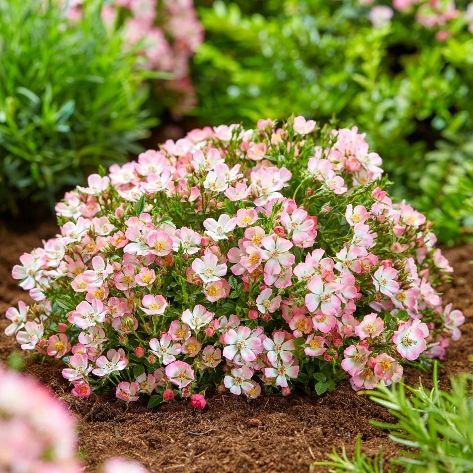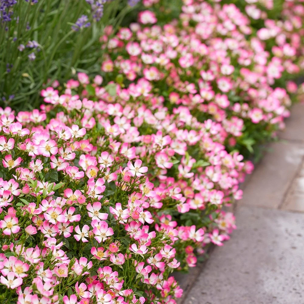 Only recently introduced, this fantastic new rose is ideal for pots or front of border positions. Its stems are thorn-free, and they spread to form a low mound, which over a long period in summer is studded with an abundance of gorgeous, apple blossom-like flowers.