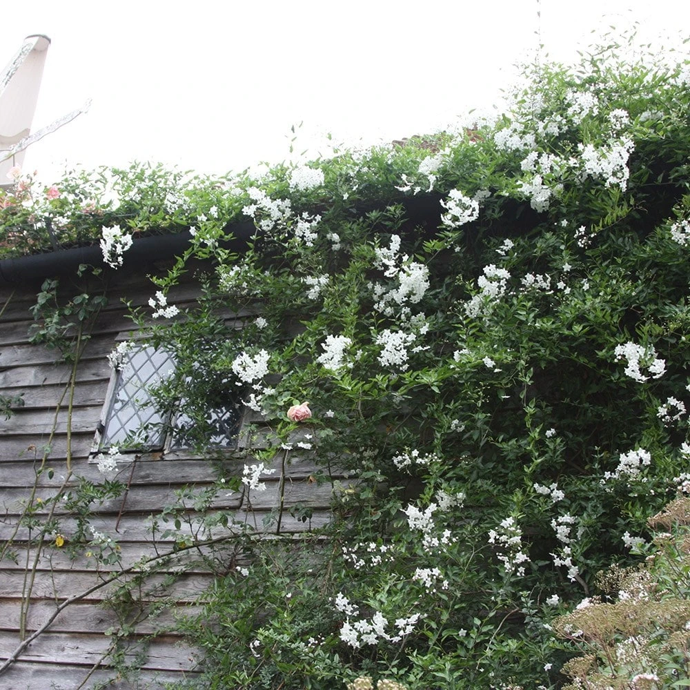 Fragrant, star-shaped, bluish-white flowers with tiny, yellow centres from June to September and glossy, dark green leaves. This jasmine-scented climber is valuable for covering sheltered walls or for growing through other shrubs or climbers. The tiny purple-black autumn berries contrast well with the decorative seedheads of late-flowering clematis. In frost-prone areas grow under glass.