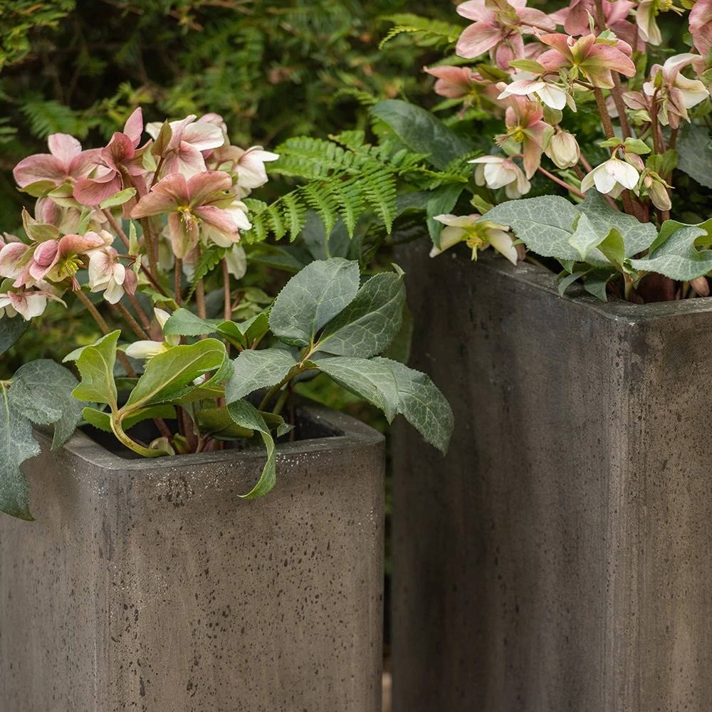 Tall and slender cube pot with a smooth cement grey finish. This shape drains well, making it a good choice for Mediterranean plants, woody herbs and other plants that like to stay on the drier side.