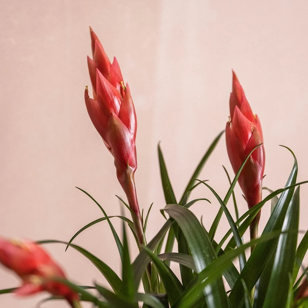 The slender green foliage of this flowering indoor plant forms in gently splaying rosettes, and these are accompanied (usually from spring to autumn), by spectacular spear-like heads of bright red bracts. An eye-catching and easy to grow house plant, it could also be moved out onto a patio or balcony during the summer months.
